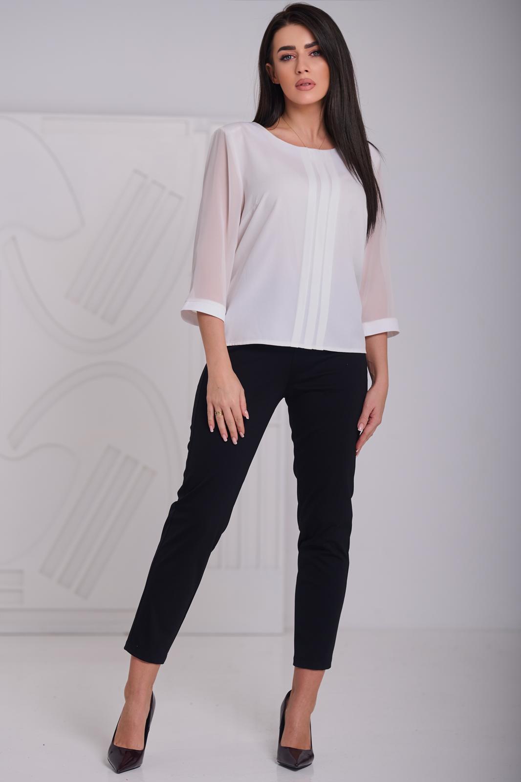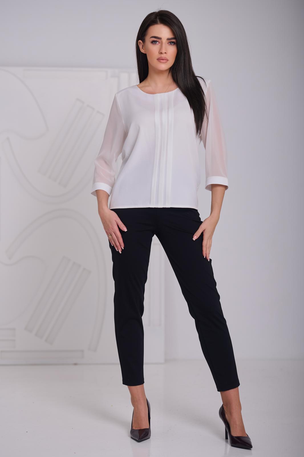 Model z klasycznym, okrągłym dekoltem oraz ozdobnymi pionowymi zakładkami z przodu, dodającymi całości subtelnej elegancji. Rękawy o długości 3/4 wykonane z lekkiego, półtransparentnego materiału, zakończone gładkim mankietem.