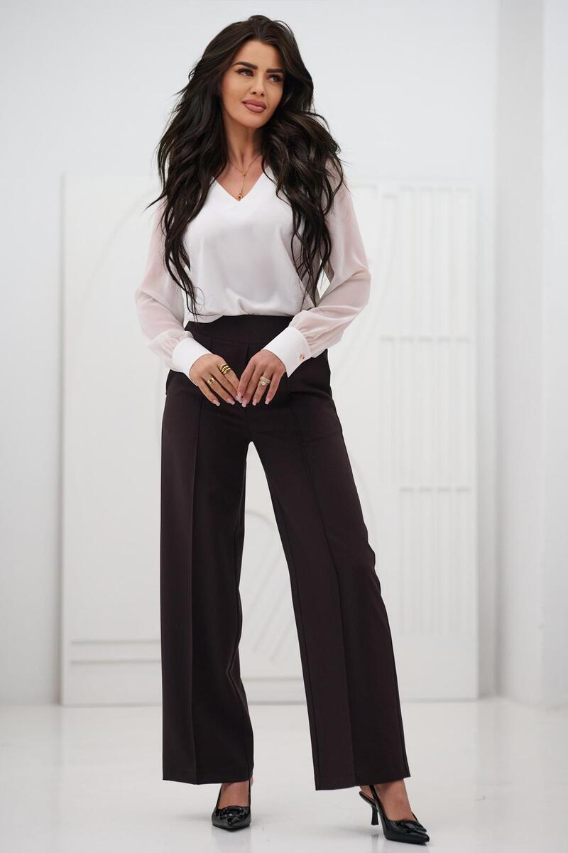 Bluzka ma elegancki, klasyczny fason z lekką, zwiewną górą. Wykonana jest z gładkiego materiału o delikatnym połysku, z dekoltem w kształcie litery V, który subtelnie wysmukla szyję.