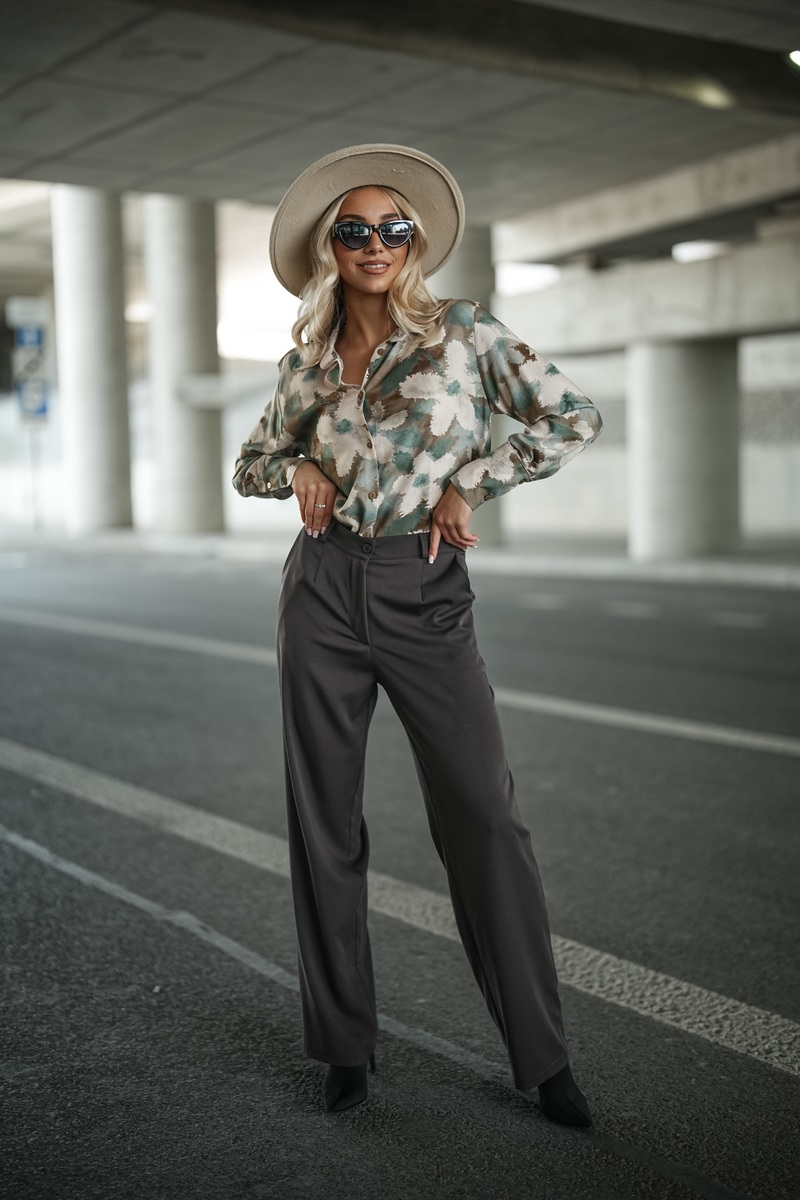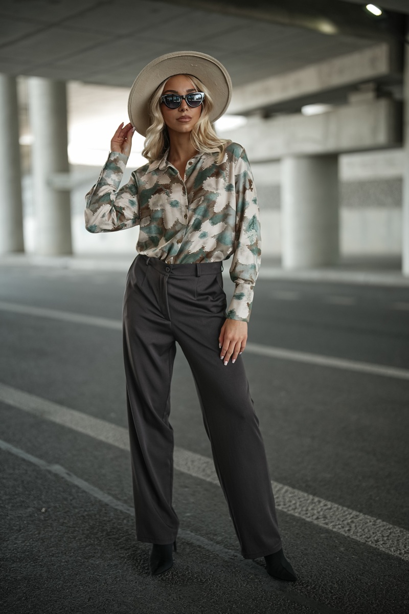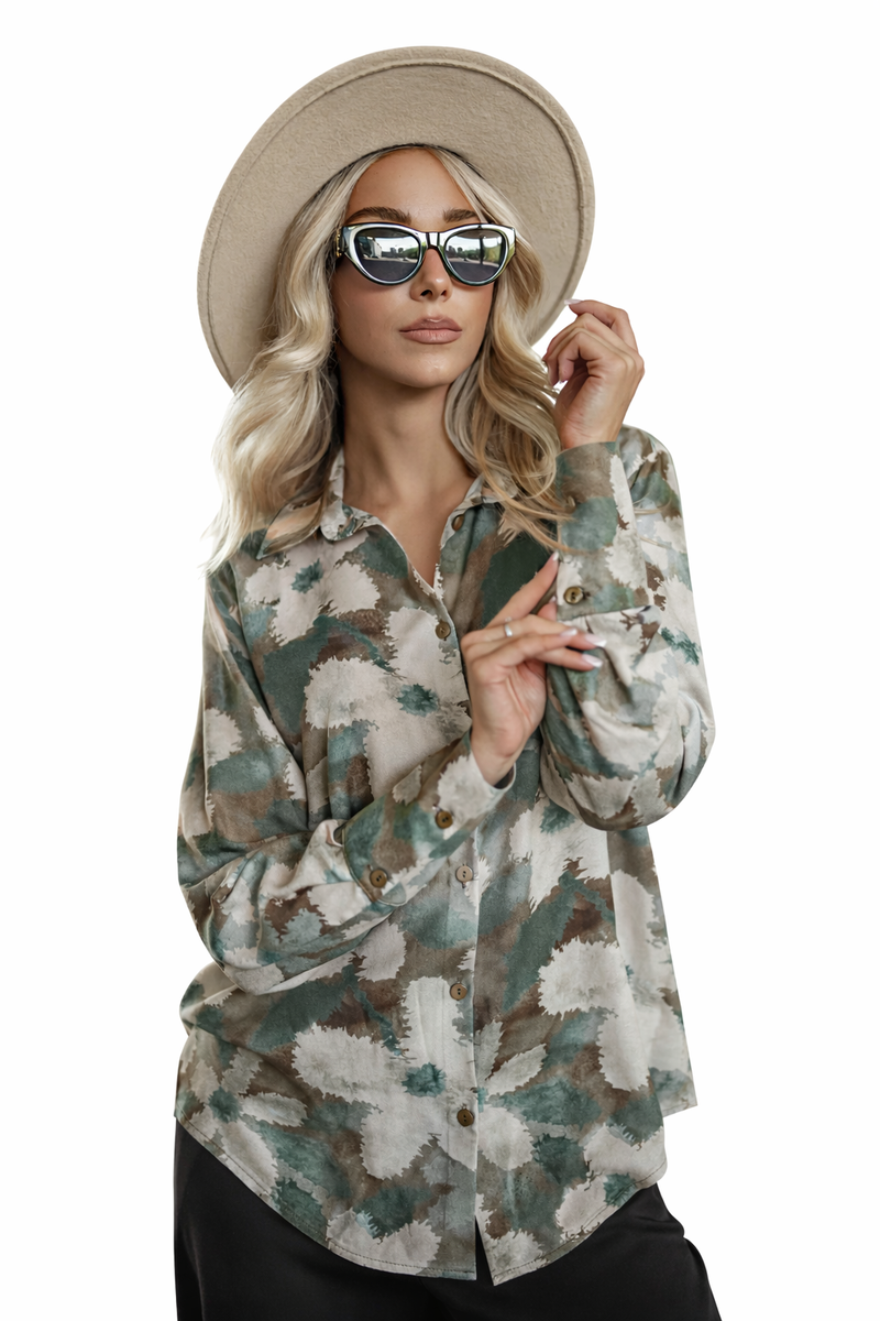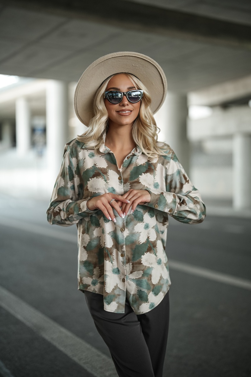 Model wyróżnia się oryginalnym printem o artystycznym, kwiatowo-abstrakcyjnym charakterze w modnych odcieniach zieleni, beżu i brązu. Ten nadruk sprawia, że koszula nie potrzebuje wielu dodatków – sama w sobie tworzy efekt „wow”.