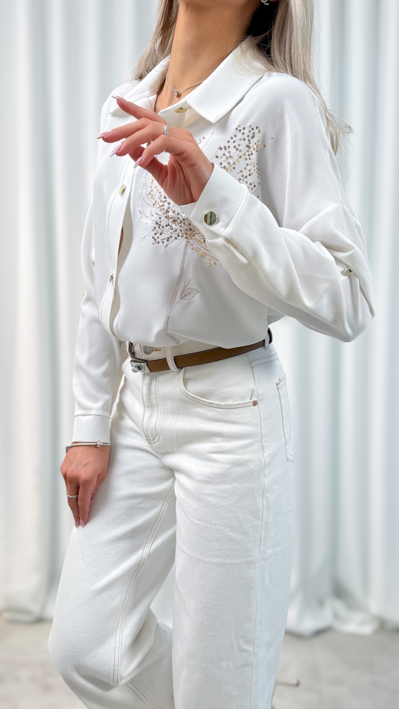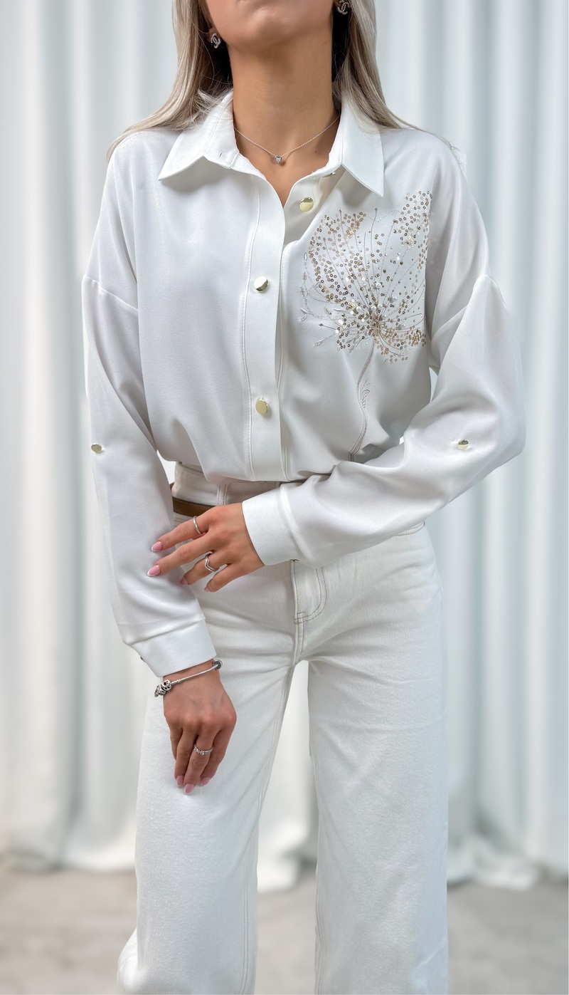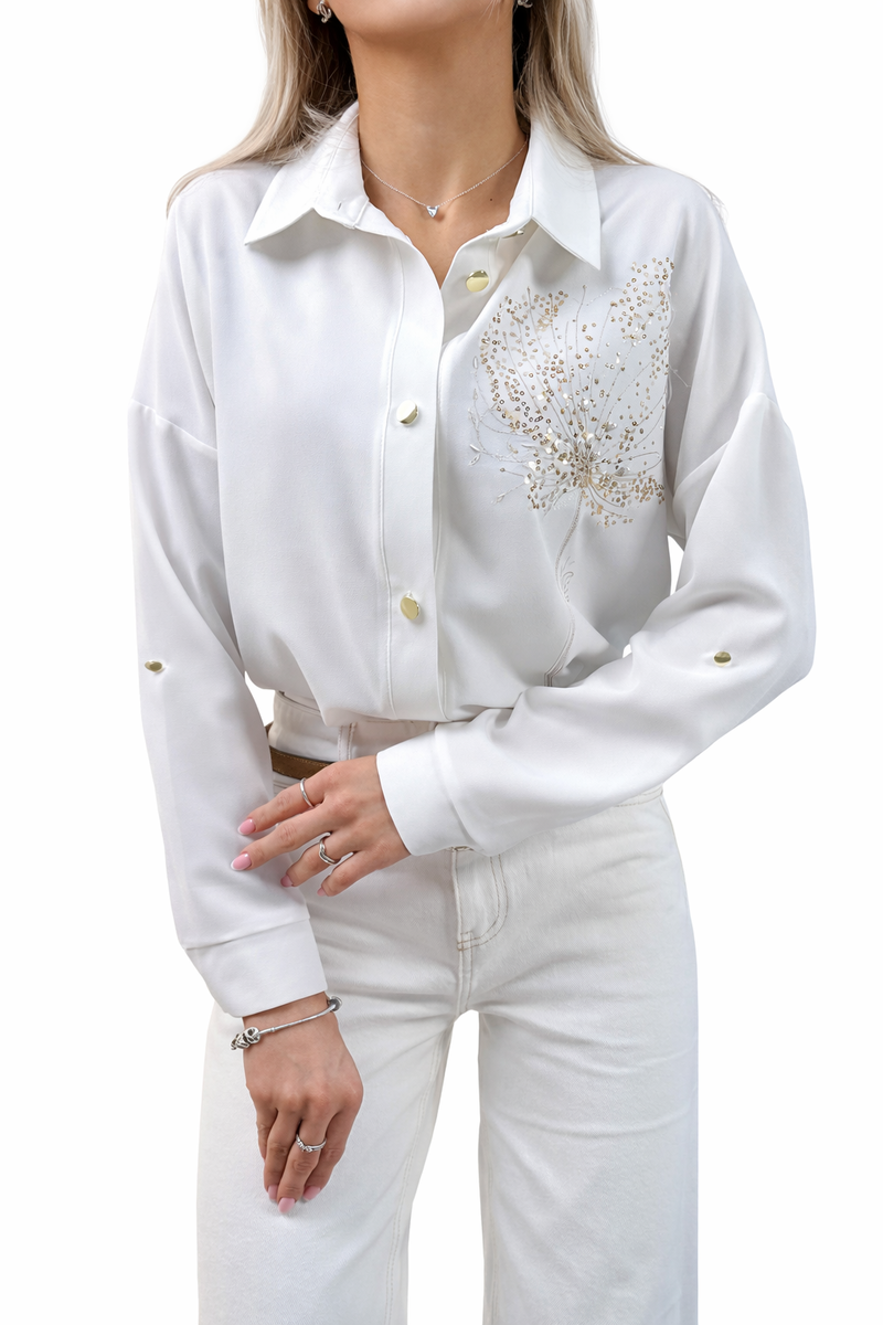 Wyjątkowym elementem modelu jest dekoracyjny haft florystyczny umieszczony z przodu koszuli. Delikatne wzory w odcieniach srebra i szarości dodają całości kobiecego i eleganckiego charakteru, przyciągając uwagę i wyróżniając koszulę spośród klasycznych modeli.