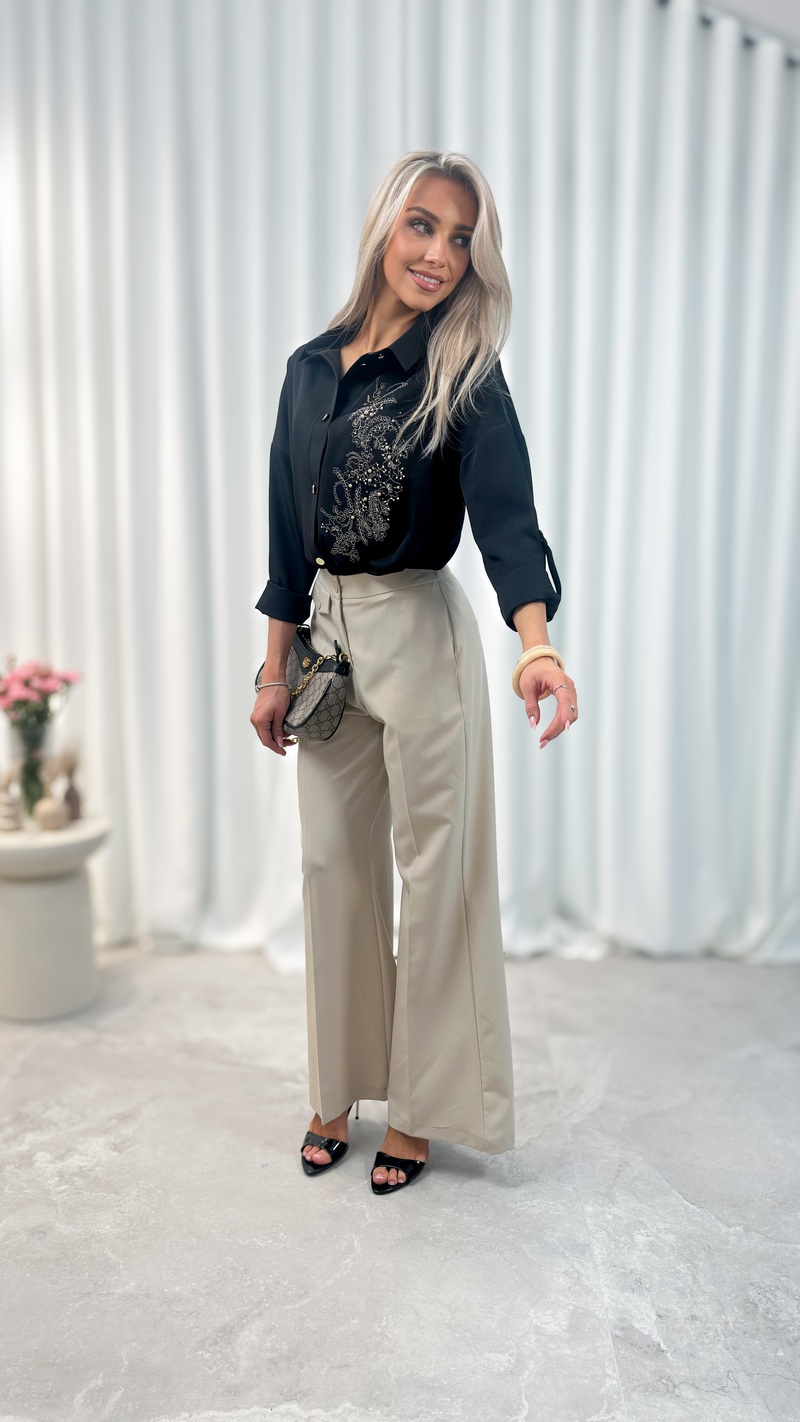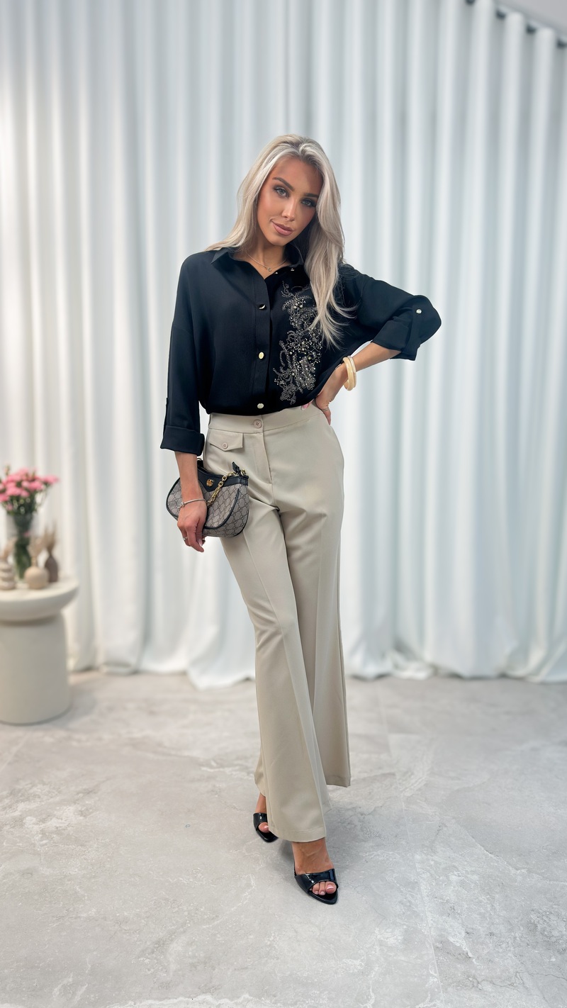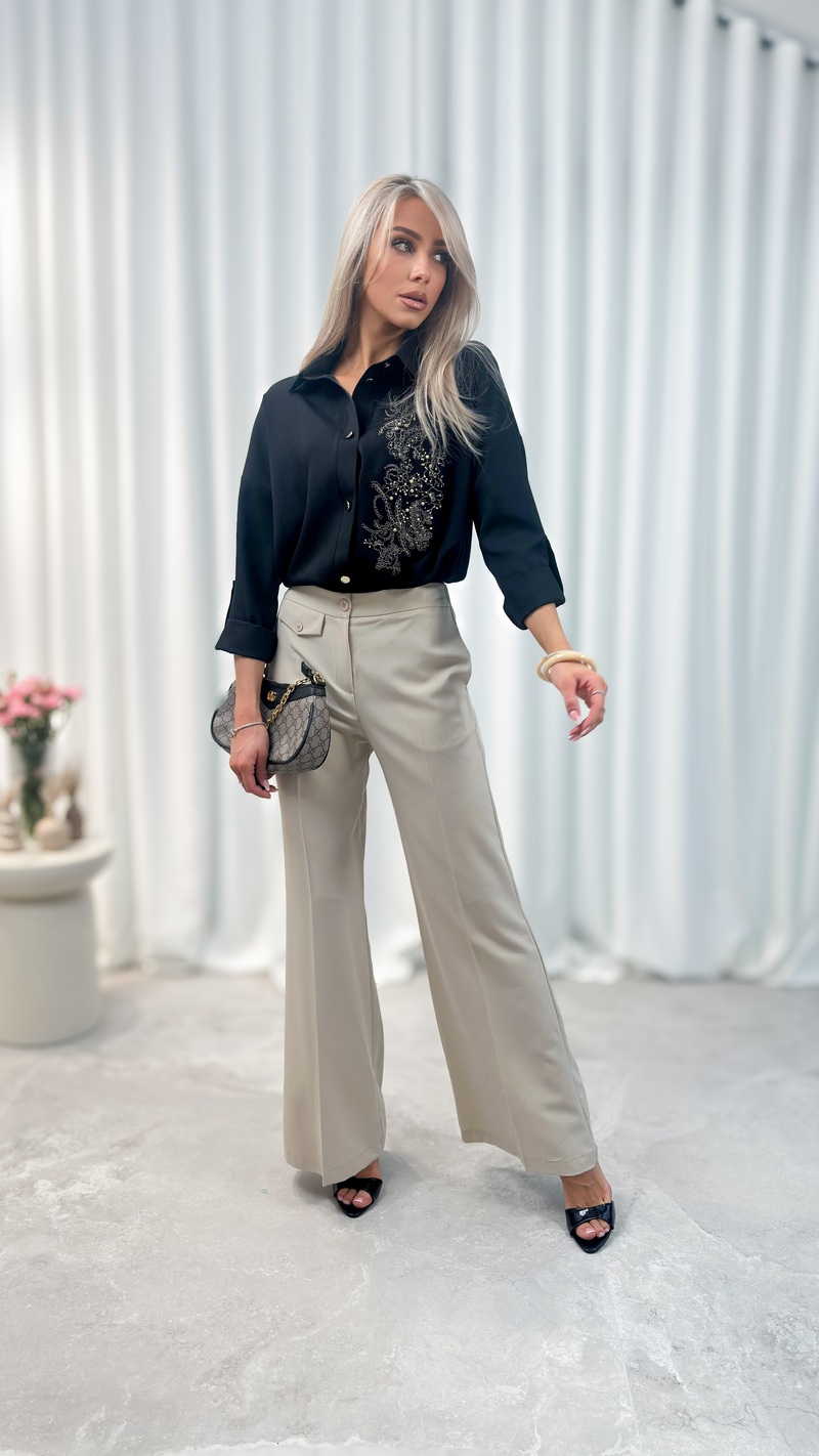 Wyjątkowym elementem modelu jest dekoracyjny haft florystyczny umieszczony z przodu koszuli. Delikatne wzory w odcieniach srebra i szarości dodają całości kobiecego i eleganckiego charakteru, przyciągając uwagę i wyróżniając koszulę spośród klasycznych modeli.