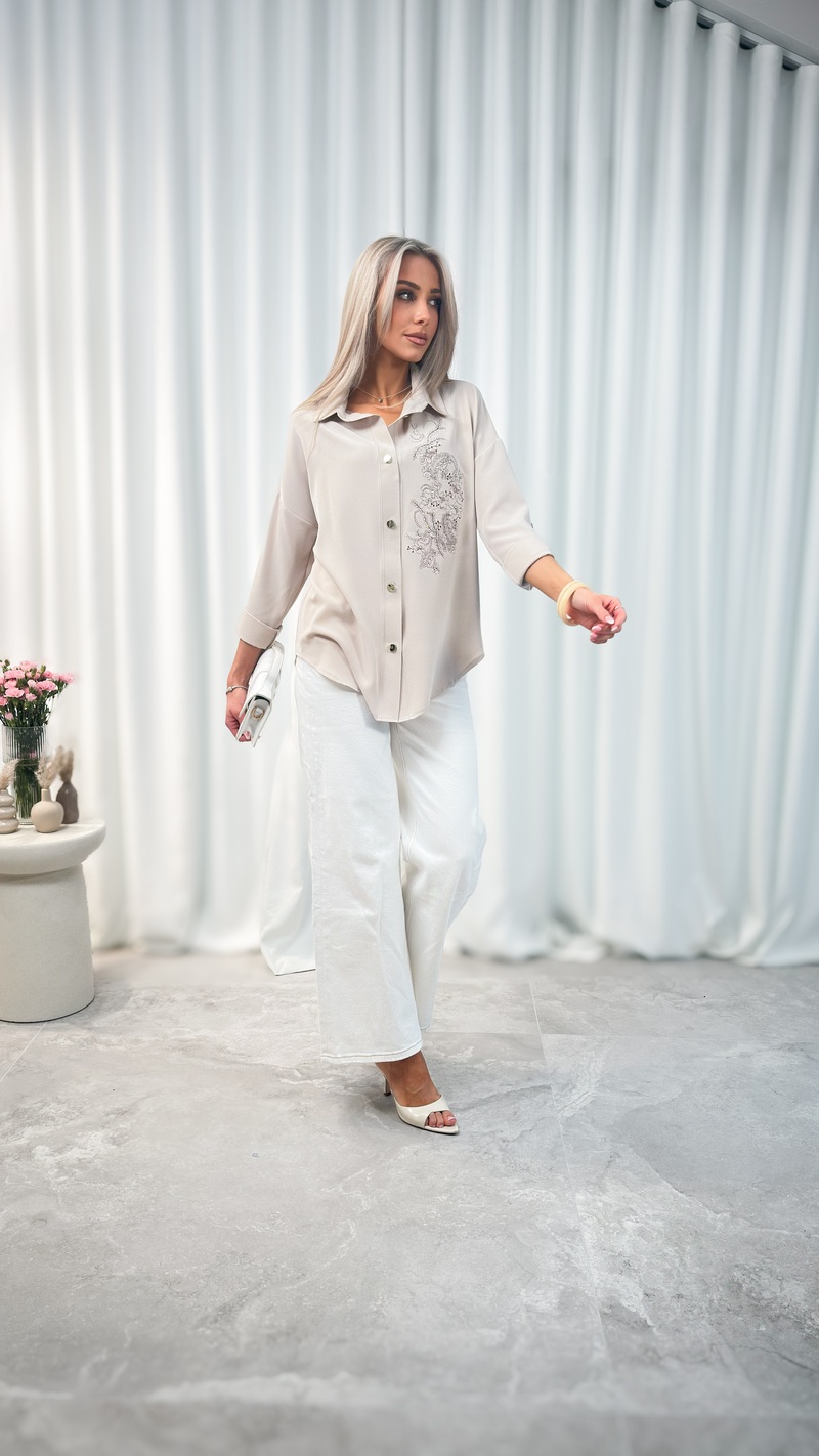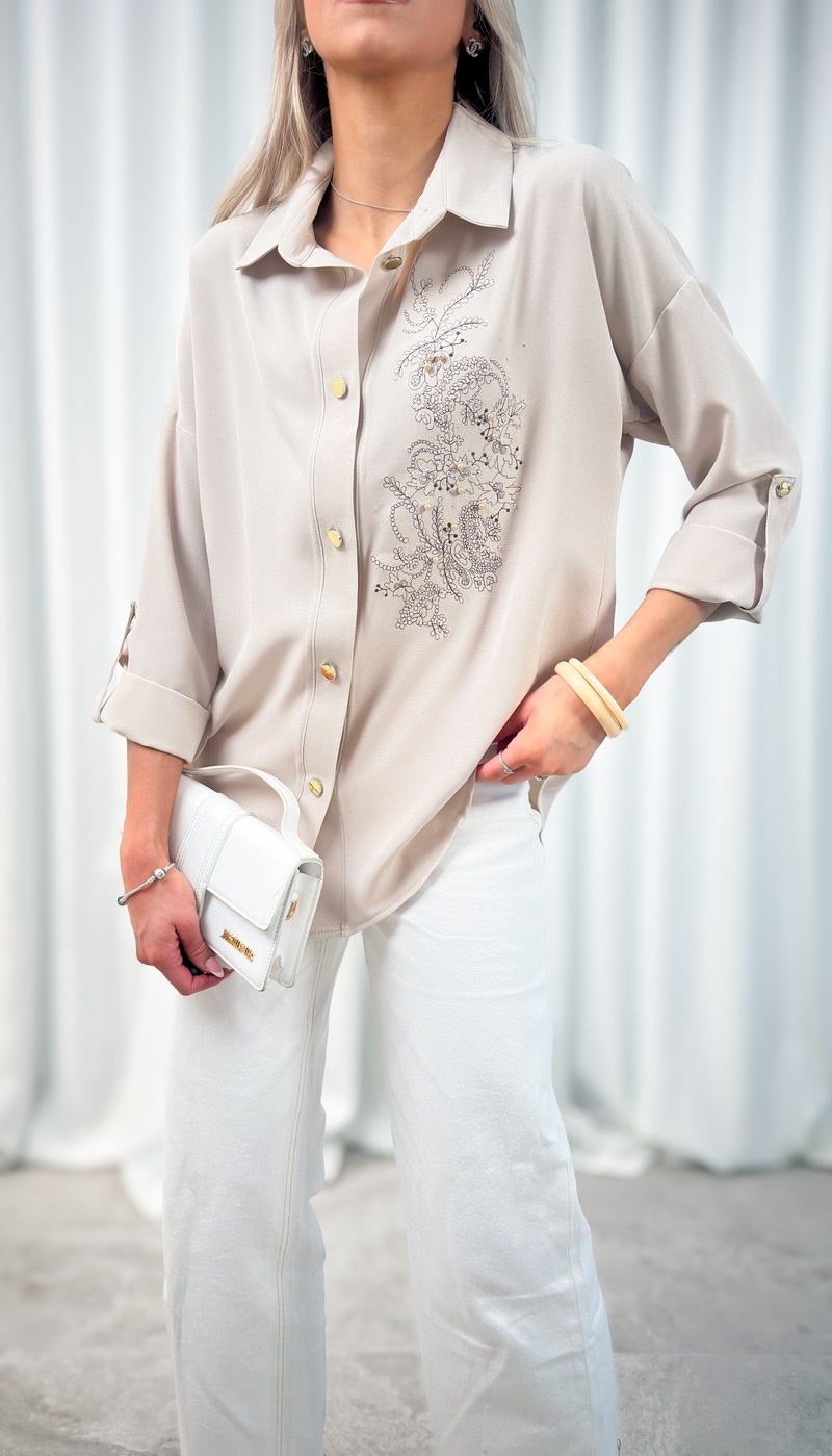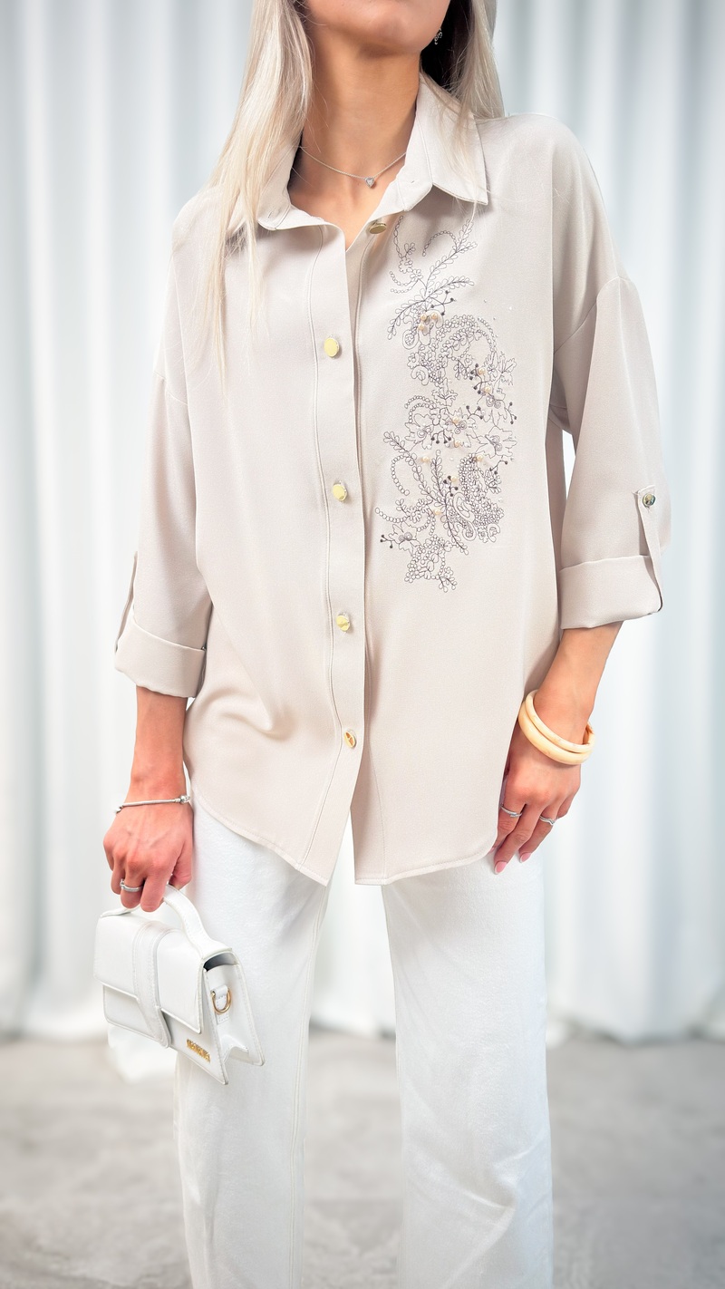 Wyjątkowym elementem modelu jest dekoracyjny haft florystyczny umieszczony z przodu koszuli. Delikatne wzory w odcieniach srebra i szarości dodają całości kobiecego i eleganckiego charakteru, przyciągając uwagę i wyróżniając koszulę spośród klasycznych modeli.