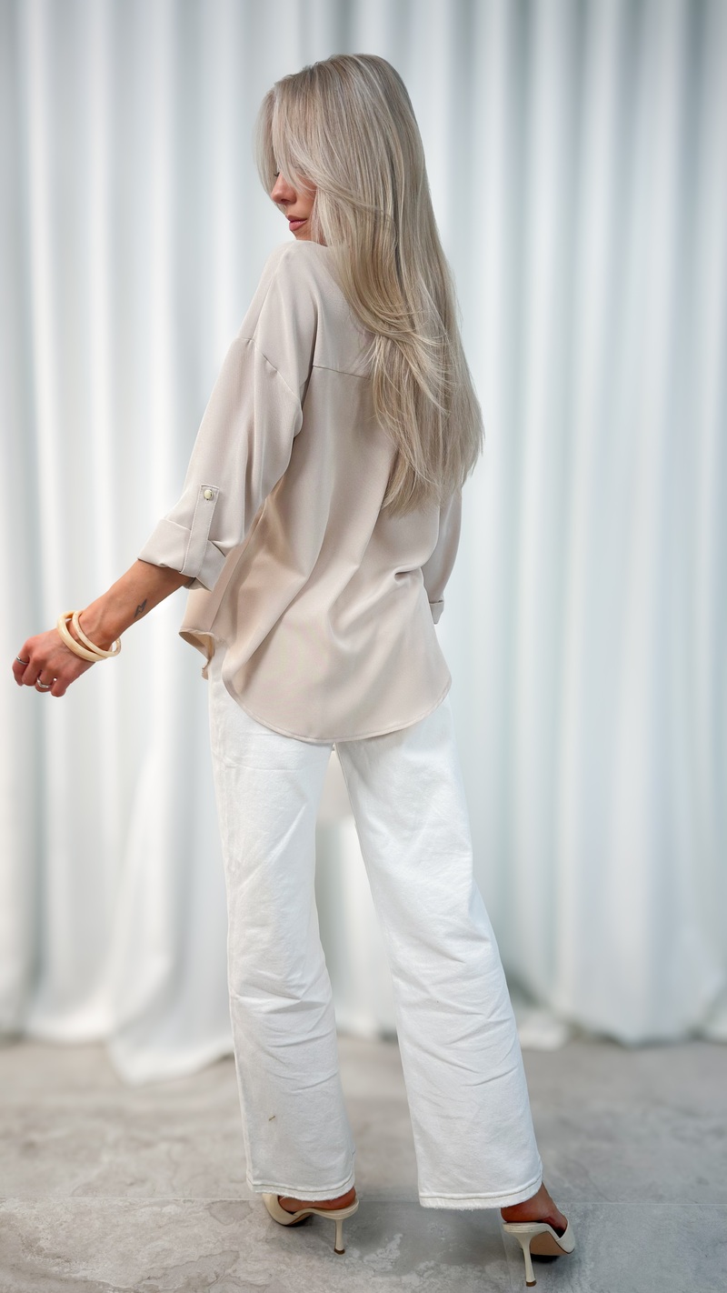 Stylowa i ponadczasowa koszula damska w kolorze ecru, która łączy elegancję z wygodą noszenia. Wykonana z lekkiego, przyjemnego w dotyku materiału, doskonale układa się na sylwetce i zapewnia komfort przez cały dzień.