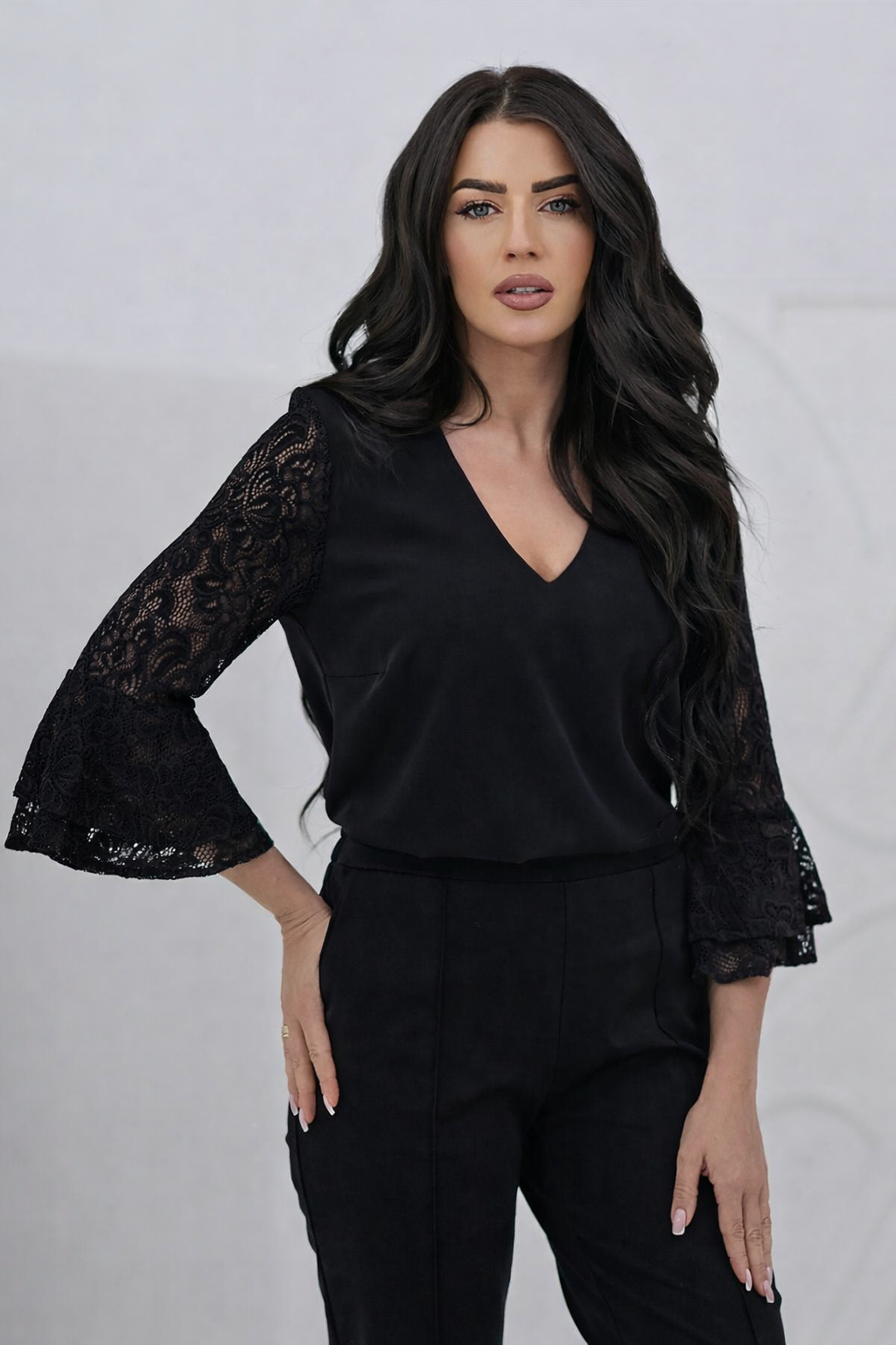 Bluzka posiada kobiecy dekolt V, który optycznie wysmukla szyję i podkreśla sylwetkę. Rękawy 3/4 wykonane z delikatnej koronki nadają całości lekkości i subtelnej elegancji. Luźniejszy krój zapewnia wygodę noszenia przez cały dzień.